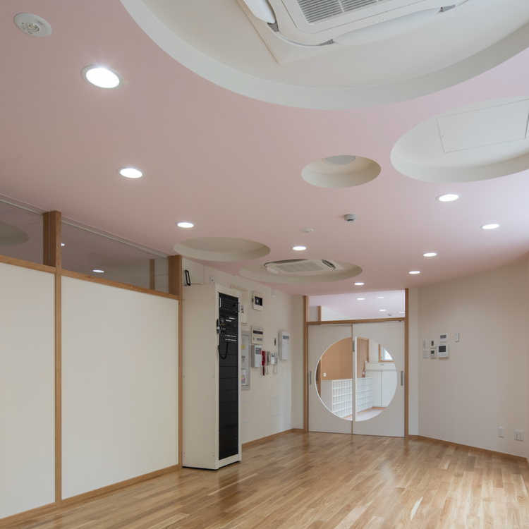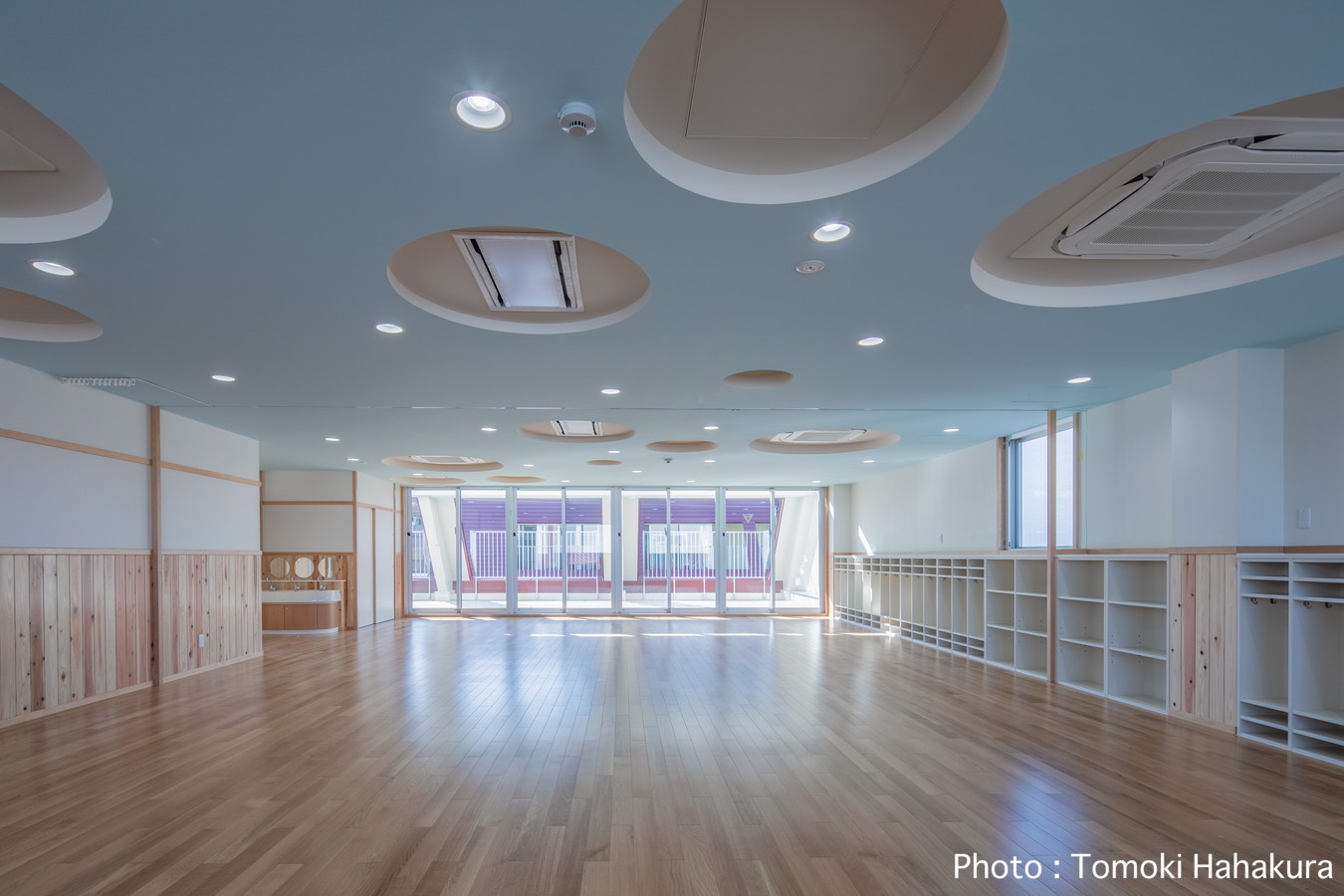 前面道路の幅員は4mと狭く、道路斜線制限をクリアするために保育室の天井高は2350mmに抑えられているが、設備計画とも合わせてリズミカルに円形の折り上げを設け、開口部も垂壁のない天井までの高さとすることで、明るく広がりのある保育空間が実現できたのではと考えている。