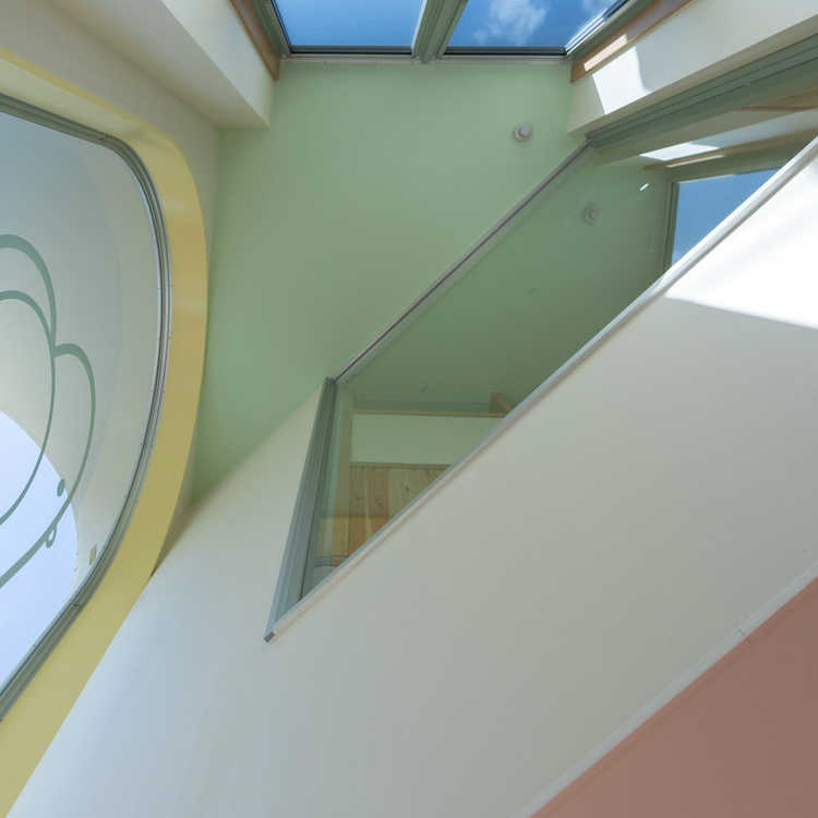 また、保育室と廊下の天井は塗装仕上げとし、2棟ともに1階はピンク色、2階は緑色、3階は水色のパステルカラーで統一することで一体感を持たせるとともに、大きな開口部を通して屋外から同じ色の天井が見える効果を狙った。