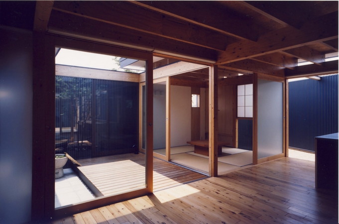 コート3はエントランスと和室、リビングにつながるコートで、この家の前庭的役割と、和室と連続する縁側空間の役割も果たす。