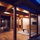 ひとつの空間のユニットとしては四畳半の大きさなのだが、柱問の建具を開閉することにより空間は閉じたり連続したりする日本の田の字型平面のような構成にした。