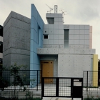 この地に住宅を依頼されたとき、社会的環境よりも、人間の冒すことのできない自然と呼応するものをつくりたいと思った。そのため、区曲整理事業によって決められた境界線や道路に対して、直角や平行に建物を配置するのではなく、地球の地軸に沿って東西南北に2枚の壁(オリエンテーション・ウォール)を配すふことにした。この壁に、太陽と水の象徴として色を与え、人間が定位するための座標軸としてグリッドを切り込んだ。